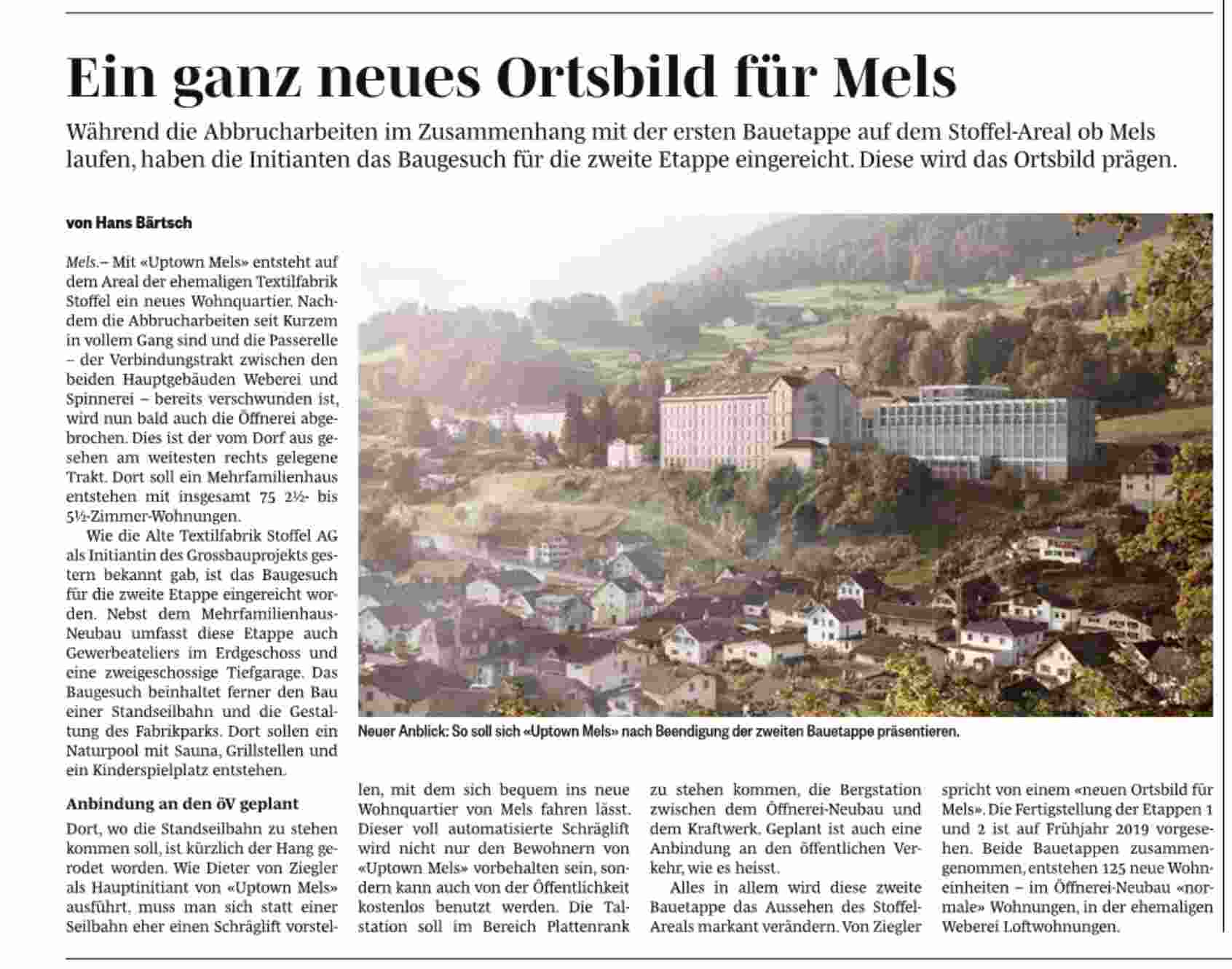 Während die Abbrucharbeiten im Zusammenhang mit der ersten Bauetappe auf dem Stoffel-Areal ob Mels laufen, haben die Initianten das Baugesuch für die zweite Etappe eingereicht. Diese wird das Ortsbild prägen. Der Sarganserländer berichtet: PDF